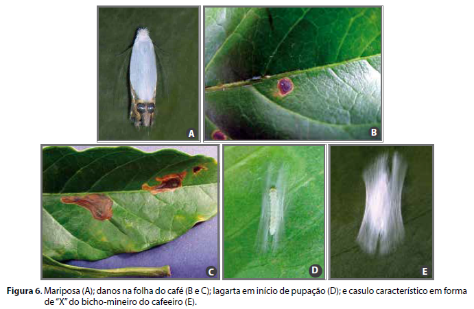 O período larval tem duração variável e oscila entre 9 e 40 dias. Ao final desse período, as lagartas abandonam o interior das folhas, saindo pela página inferior, onde tecem fio de seda e descem para a “saia” do cafeeiro, onde irão fazer casulo característico em forma de “X” (Figura 6D e 6E).