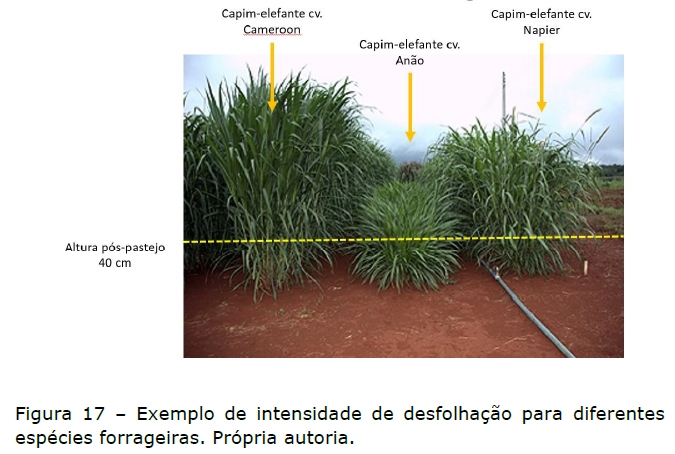 É importante ressaltar que a intensidade e frequência de desfolhação adequada varia de acordo com a planta em função do seu porte e hábito de crescimento. Por exemplo, a Figura 17 representa três cultivares de capim elefante, os quais possuem porte diferente. Especificar a mesma altura pós-pastejo para os três resultaria em maior intensidade de desfolhação do cameroon e menor intensidade de desfolhação para o anão.
