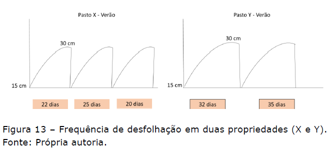 A Figura 13 representa duas propriedades (X e Y) que utilizam a mesma planta e as mesmas metas de altura pré (30 cm) e pós-pastejo (15 cm). No pasto X, em 67 dias de utilização da pastagem no verão, houveram 3 ciclos de pastejo com intervalos entre desfolhações variando de 20 a 25 dias). No pasto Y, nos mesmos 67 dias de utilização da pastagem no verão, houveram 2 ciclos de pastejo com intervalos entre desfolhações de 32 e 35 dias. Isso significa que a frequência de desfolhação em X é maior que Y. A propriedade X poderia fazer uso de maiores doses de nitrogênio, por exemplo. Como o nitrogênio acelera o crescimento da planta, a mesma altura seria atingida mais rápido e, portanto, a frequência de desfolhação foi maior.