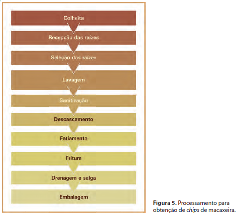 O processo para obtenção dos chips de macaxeira é um método simples, que permite a obtenção de um produto final com ótima aparência, coloração, crocância e tempo de vida útil de 15 dias. Além disso, representa uma boa alternativa para a conservação das raízes que, por apresentarem elevado teor de umidade, possuem reduzida vida pós-colheita (CARVALHO; ABREU, 2009).