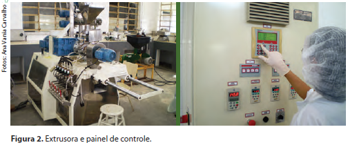 O processamento do cereal matinal é realizado em extrusora monorrosca, sendo adotados os seguintes parâmetros fixos: temperatura nas zonas do extrusor (Zona 1 = 40 °C; Zona 2 = 60 °C; Zona 3 = 80 °C), velocidade do parafuso de 177 rpm, matriz circular de 3,85 mm e sistema de corte na saída da matriz.