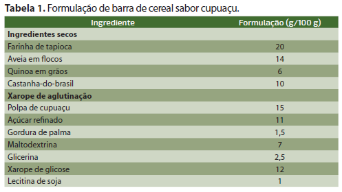 Para a formulação da barra de cereal à base de farinha de tapioca, são utilizados os seguintes ingredientes: farinha de tapioca, aveia em flocos, quinoa, castanha-do-brasil, polpa de cupuaçu, açúcar refinado, gordura de palma, maltodextrina, glicerina, xarope de glicose e lecitina de soja.