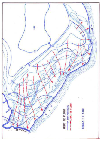 Na confecção de uma rede de fluxo, de posse dos dados de profundidade do lençol freático e do nivelamento geométrico da área, calculam-se as cotas do lençol freático para cada poço de observação, conforme Quadro ilustrativo. Em seguida, plota-se a posição dos poços em um mapa planimétrico e interpolando-se as cotas do lençol, confecciona-se a planta de suas curvas de nível, para uma determinada equidistância vertical entre curvas, conforme mostra Figura a seguir.
