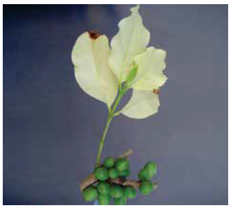 A variegação é uma anomalia citoplasmática, que se caracteriza pela descoloração parcial ou total das folhas do cafeeiro, podendo afetar um ou mais ramos da planta, porém, de ocorrência esporádica e sem prejuízos econômicos ao cafeeiro.