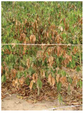 Em casos mais graves, com morte dos tecidos dos ramos (plagiotrópicos e ortotrópicos), recomenda-se aguardar pelos sinais de brotações novas, para nortear as medidas a serem tomadas, com relação, principalmente às podas, para recuperação das plantas.