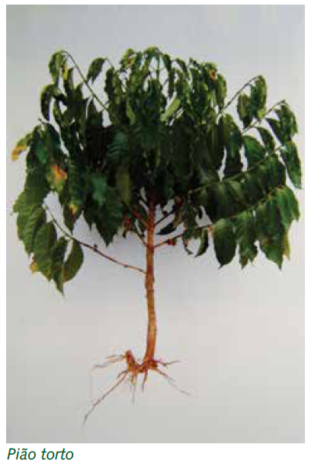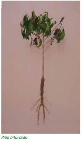 Esse problema tem sintomas semelhantes à do pião torto. As causas mais comuns são o corte alto do fundo dos saquinhos ou o aproveitamento de mudas cujo torrão (“bloco”) tenha se partido ao meio, durante o manuseio no transporte e nas operações de plantio.