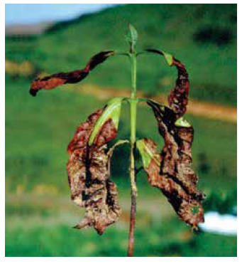 Dependendo da intensidade da injúria, a queima nas folhas pode se estender por toda a planta, chegando a acarretar a sua morte.