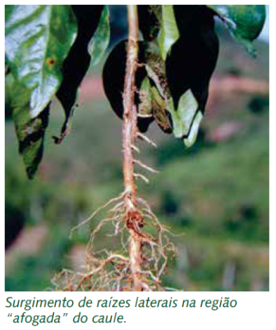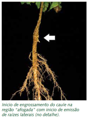 O contato da terra com essa porção inicial do caule e a tentativa da planta de buscar compensar a sua pequena capacidade de condução de seiva induz o surgimento de raízes laterais e um engrossamento anormal da região afogada do caule, com desestruturação dos tecidos da casca (floema), que se apresentam com rachaduras e descorticamento.