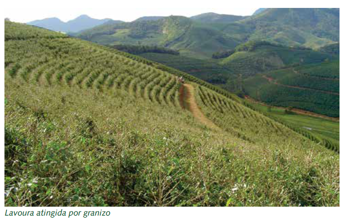 O cafezal está exposto, além dos fenômenos climáticos relatados até aqui, também à ocorrência de chuva de granizo, intempérie muito temida e para a qual não há planejamento na implantação da lavoura que possa diminuir a vulnerabilidade do empreendimento, dada a natureza da ocorrência.
