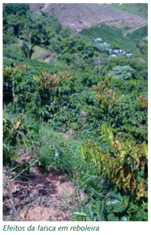 Seus danos são caracterizados pela queima que atinge os ramos e as folhas. A identificação da ocorrência de faísca elétrica é o aparecimento repentino dos sintomas, após tempestades, diferentemente de doenças, cuja evolução é mais lenta.