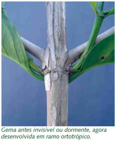 O cafeeiro é uma planta arbustiva que cresce de forma contínua, emitindo ramos ortotrópicos (verticais), plagiotrópicos (laterais) e ramos adicionais, tanto sobre os ortotrópicos (ladrões) quanto sobre os laterais (ramos secundários, terciários, etc.).