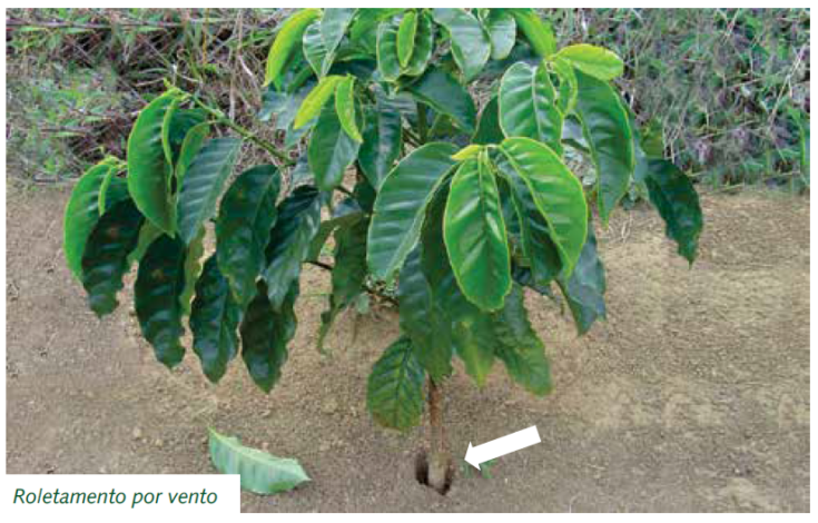 Em alguns locais, a ação de ventos constantes sobre a muda de café provoca movimentos da sua copa, com deslocamentos do caule junto ao solo. Essa fricção repetida do caule com o solo provoca lesões, muitas vezes em forma de anel (roletamento) e podem levar à morte da muda.