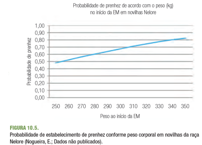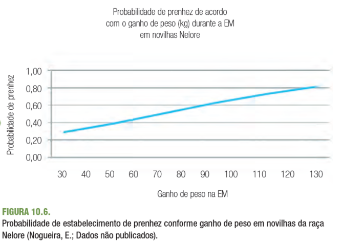Nas figuras 10.5 e 10.6, é ilustrada a importância do peso de entrada de novilhas Nelore e a importância do ganho de peso durante a Estação de Monta sobre a capacidade de a novilha tornar-se prenha na sua primeira estação de monta.
