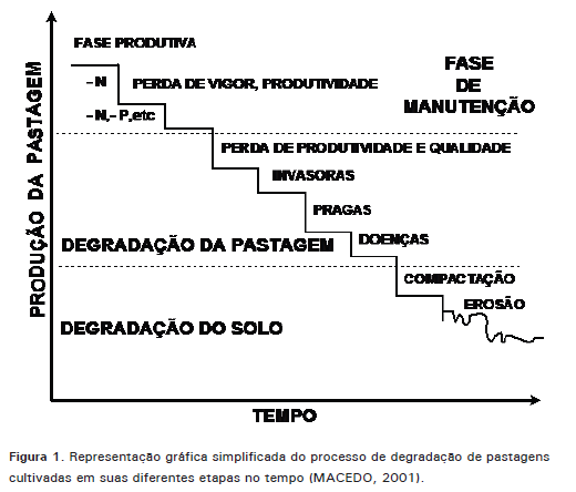Já, a renovação consiste no restabelecimento da produção da forragem com a introdução de uma nova espécie ou cultivar, em substituição àquela que está degradada (MACEDO et al., 2000).