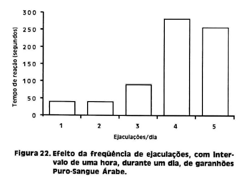 Além do mais, as ejaculações sucessivas durante o dia também são afetadas pelo tempo de reação após o segundo ejaculado. O garanhão exige acima de 60% do tempo inicial para reagir com ereção, monta e ejaculação, quando em presença da fêmea, às vezes estando desinteressado (Figura 22).