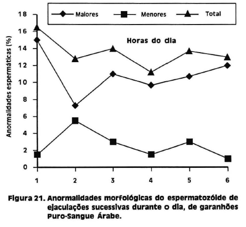 Foi observado um declínio no total das anormalidades morfológicas dos espermatozoides em coletas diárias entre as horas do dia (P < 0,05) Apesar das variações individuais observadas entre as coletas, os níveis de anormalidades não devem prejudicar a fecundação (Figura 21). Alguns estudos já estabeleceram que a taxa de anormalidades morfológicas acima de 20% para defeitos maiores e 20% para os menores, num total acima de 40%, pode comprometer a taxa de fertilidade. Entretanto, esta taxa está na dependência do tipo de anormalidade individual, podendo ser compensada por uma maior concentração.