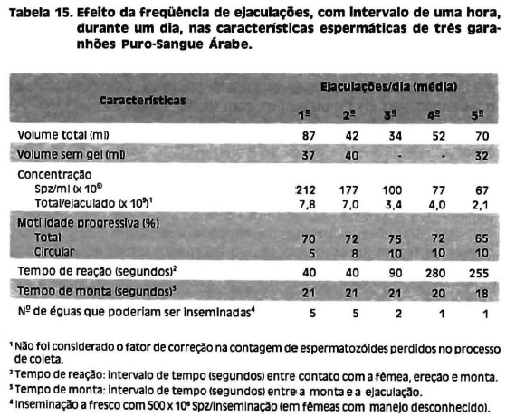 Na Tabela 15 são mostradas as características espermáticas e de comportamento, quando o garanhão é exigido para cobrir até cinco vezes ao dia.