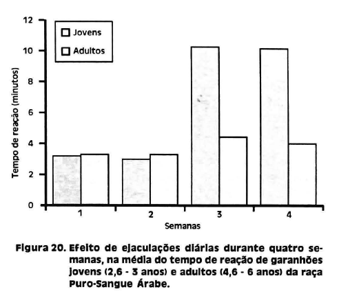 O tempo de reação para os garanhões jovens foi, em média, acima de dez minutos a partir da terceira semana de exigência e, em média, 70% acima do tempo inicial, às vezes até inexistente para certos indivíduos. Nos adultos houve pouca variação (Figura 20), o tempo aumentando em 13% em relação à semana inicial. A utilização de garanhões submetidos a regime intensivo de ejaculação exige maior controle quanto a sua capacidade reprodutiva.