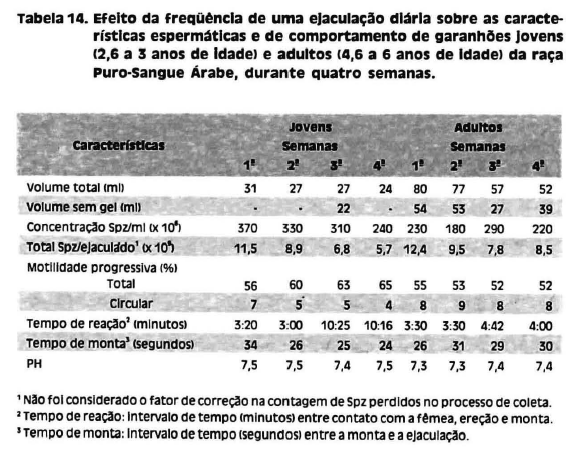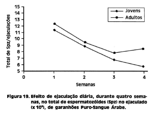 A frequência de utilização do garanhão sendo diária, observou-se que ocorre queda acima de 60% do volume e concentração total de células espermáticas, tanto nos jovens como nos adultos, após a segunda semana.