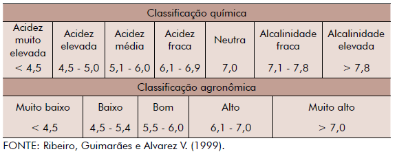 Para pH em água, utiliza-se a seguinte interpretação: