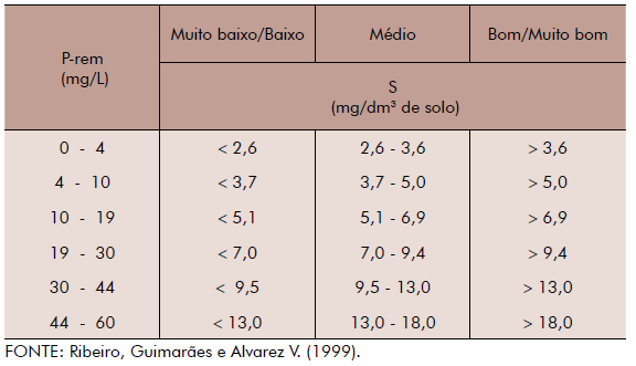 Para a interpretação dos níveis de S no solo, deve-se considerar o resultado do P-rem como a seguir: