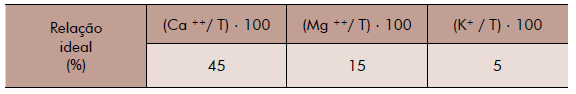 Também é interessante observar a saturação de cada base na CTC total do solo. Assim como no caso anterior, cada cultura exige uma saturação específica de cada nutriente.