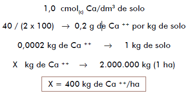 Em 1 hectare, considerando a camada arável de 0 a 20 cm tem-se 2000 m3 de solo ou 2.000.000 kg, por regra de três tem-se: