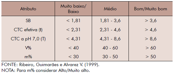 Os atributos discutidos nos itens 1 a 9 referem-se a determinações analíticas feitas no laboratório, como descrito. Os itens 10 a 16 correspondem a cálculos realizados a partir dos resultados analíticos obtidos. São eles; soma de bases (SB), CTC efetiva (t), CTC a pH 7 (T), porcentagem de saturação por bases (V%), porcentagem de saturação por Al (m%), relações entre bases e relações entre bases e CTC.