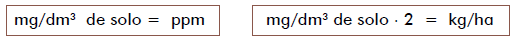 Unidade: mg/dm3 de solo, que corresponde ao antigo ppm (não recomendado no Sistema Internacional de Unidades), e pode ser transformada em kg/ha, utilizando a fórmula a seguir: