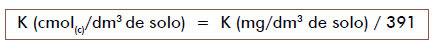 Observação: para o cálculo dos atributos de 10 a 16, deve-se primeiramente fazer a transformação do K de mg/dm3 de solo para cmol(c)/dm3 de solo, o que pode ser feito utilizando a seguinte fórmula: