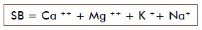 São considerados bases do solo o Ca, o Mg e o K. Para os solos salinos deve-se considerar, ainda, o sódio (Na). O cálculo da SB é feita utilizando a seguinte fórmula: