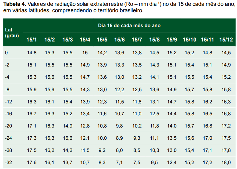 Os valores da radiação solar extraterrestre (Ro – mm dia-1) podem ser calculados ou obtidos em tabelas (livros de agrometeorologia) e variam em função da latitude onde se encontra a propriedade e o dia do ano. As variações são maiores quanto mais distante do Equador, exemplo: de 13,6 mm dia-1 a 15,5 mm dia-1 (Latitude 0o ); 11,5 mm dia-1 a 16,3 mm dia-1 (Latitude 12o ); e 9,4 mm dia-1 a 17,4 mm dia-1 (Latitude 22o ), Tabela 4.
