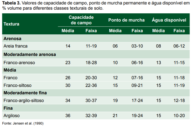 Conhecimento da textura do solo e de suas propriedades físico-hídricas (capacidade de campo e ponto de murcha permanente (Tabela 3)).
