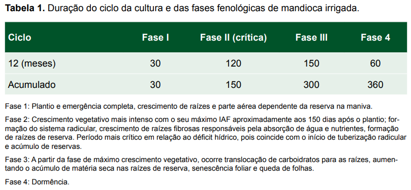 As necessidades de irrigação da mandioca dependem do clima da região, da época de plantio, dos sistemas de irrigação, dos espaçamentos de plantio, dos sistemas de cultivo (consórcio ou solteiro), do manejo de água e solo. O crescimento da planta nas principais fases do ciclo é principalmente dependente da temperatura ambiental (energia disponível) e da disponibilidade de água no solo (Tabela 1).