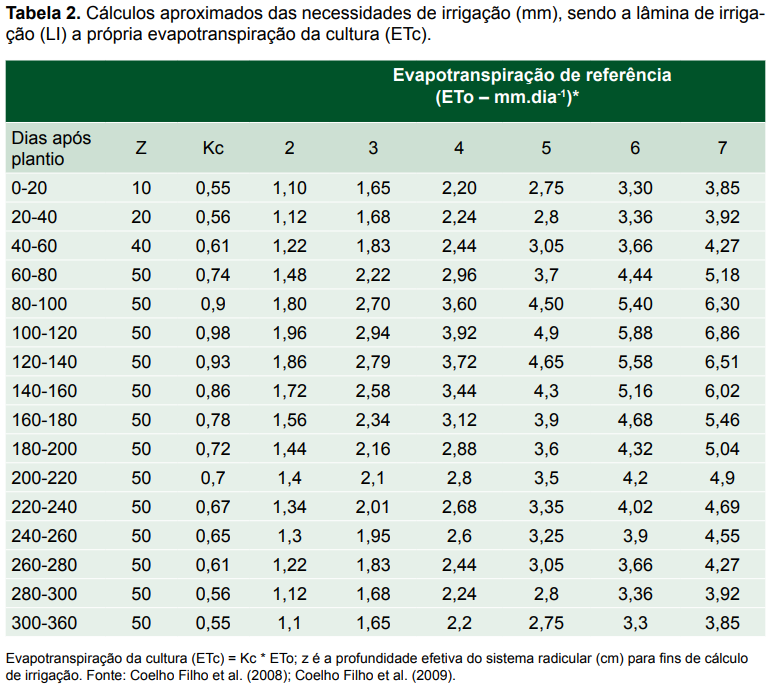 A evapotranspiração da cultura ETc, água evaporada do solo, somada à transpirada pela cultura, é base para determinar as necessidades de irrigação. A reposição de água é empregada para garantir a manutenção da umidade do solo em níveis adequados às diferentes fases de desenvolvimento da planta. A ETc, variável ao longo do ciclo e das condições ambientais, é obtida com base nos coeficientes de cultura (Kc) encontrados na Tabela 1 e dos valores estimados de ETo: