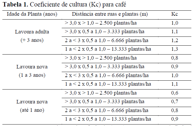 O coeficiente de cultura (Kc) é uma variável adimensional que varia de acordo com a fase fenológica, com o manejo, com o estande das plantas e, também, com as condições climáticas e épocas de plantio, já que os parâmetros locais (temperatura, umidade relativa, vento, radiação solar) e as variações fisiológicas e aerodinâmicas da cultura influenciam diretamente a evapotranspiração (Mudrik, 2005). Folegatti e Fernandes (2013) propuseram valores de Kc para a cultura do café em função da idade, espaçamento e números de plantas por hectare (Tabela 1).