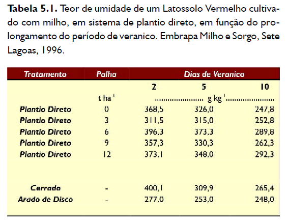 Um último passo antes de se implantar o sistema de plantio direto, e que deve ser mantido constantemente, é o de formação de uma cobertura morta sobre o solo, conseguida através do manejo dos resíduos da cultura anterior, ou com plantas cultivadas com essa finalidade. Como o sistema de plantio direto mantém os resíduos na superfície, podem aumentar os riscos de que ocorram algumas pragas e doenças. Portanto, a rotação de culturas deve ser adotada como regra, especialmente como medida para tentar reduzir a incidência dessas pragas e doenças. A rotação também tem papel importante na nutrição das plantas, pois é sabido que o sistema de plantio direto modifica a dinâmica dos nutrientes. Assim, atenção especial deve ser dada, principalmente nos primeiros anos de implantação da técnica, quando poderá ocorrer maior imobilização de nutrientes na biomassa de resíduos de plantas e microbiana do solo, para o caso particular do nitrogênio. Deixar os resíduos da cultura anterior sobre a superfície do solo, como cobertura morta, é uma das práticas mais eficientes de controle da erosão. Além de impedir o impacto direto das gotas de chuva ou de irrigação sobre o solo, evita o desprendimento das partículas, favorece a atividade biológica, a infiltração de água e constitui uma barreira ao escorrimento da enxurrada, além de manter a umidade do solo por mais tempo, pois dificulta a evaporação da água. A presença da cobertura morta auxilia também no controle das plantas daninhas, dependendo da sua quantidade e distribuição, podendo haver uma economia significativa de herbicidas após o estabelecimento de cobertura do solo com resíduos em plantio direto, o que é um fator extremamente importante tanto do ponto de vista econômico quanto ambiental. Outra consideração diz respeito à economia de água com a adoção do sistema. Avaliação do conteúdo de água no solo, realizado na Embrapa Milho e Sorgo, em Latossolo Vermelho, sob diferentes condições de uso, durante um período de veranico, mostrou que, sob plantio direto de milho, a perda de água do solo foi acentuadamente menor do que sob preparo com arado de disco ou sob vegetação de cerrado (Tabela 5.1), o que indica uma economia de água em favor do sistema de plantio direto.