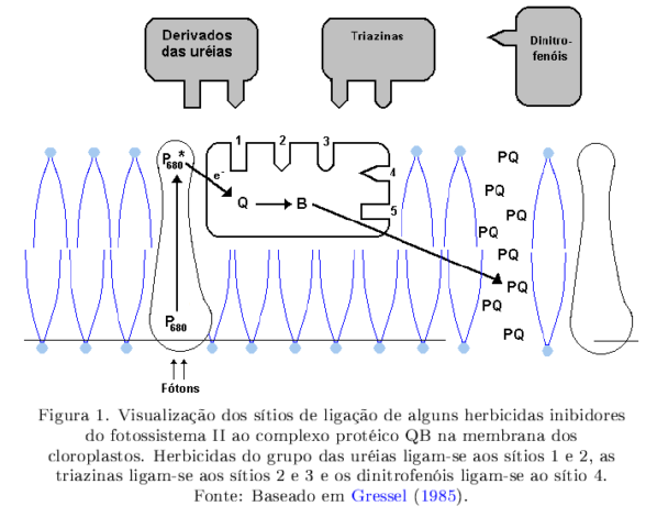 A inibição da fotossíntese acontece pela ligação dos herbicidas deste grupo ao sítio de ligação da QB, na proteína D1 do fotossistema II, o qual se localiza nas membranas dos tilacóides dos cloroplastos, causando, por consequência, o bloqueio do transporte de elétrons de QA para QB.