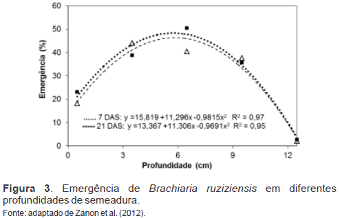 A melhor profundidade de semeadura para o estabelecimento planejado de plantas depende da temperatura, umidade e tipo de solo. Em condições de safrinha, as melhores emergências de plantas de braquiária têm sido verificadas nas profundidades de 3 cm a 6 cm (FOLONI et al., 2009, PAULINO et al, 2004; ZANON et al., 2012). Na distribuição superficial das sementes, a germinação de plantas depende da intensidade da chuva após a semeadura, e da movimentação superficial do solo pela operação de plantio (MAKINO et al., 2012); em profundidades maiores, a garantia de emergência uniforme de plantas depende também da utilização de sementes com alto vigor.