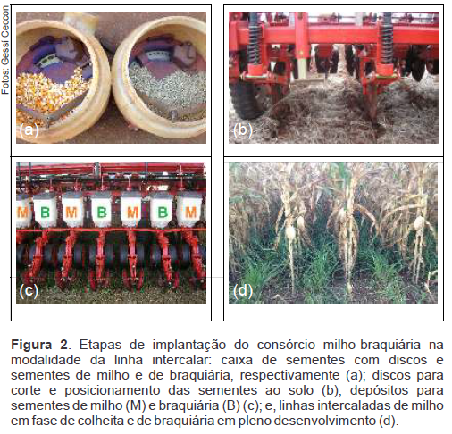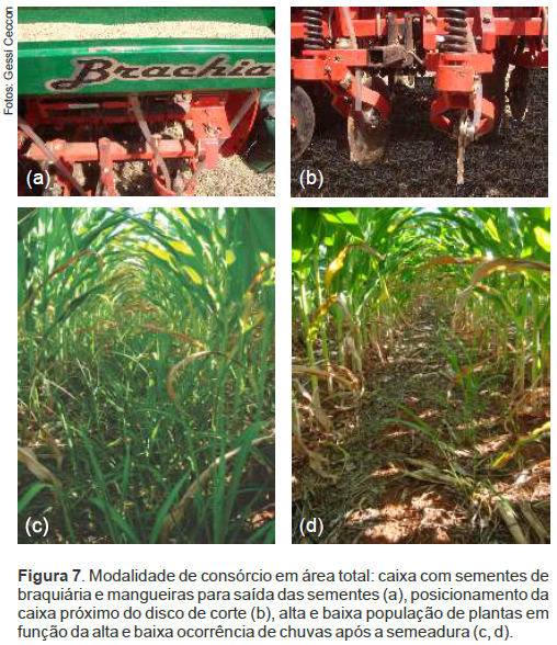 Quando houver adubação de cobertura no milho, a semeadura da forrageira pode ser realizada nesta operação, minimizando o efeito competitivo com o milho pela semeadura e emergência defasada da braquiária (JAKELAITIS et al., 2006). O consórcio com linhas intercaladas de milho safrinha e B. ruziziensis contribuiu para a evolução do consórcio em escala comercial, em razão dos resultados de pesquisa sobre a viabilidade da tecnologia (CECCON et al., 2005, 2007, 2009) e, principalmente, pela identificação do consumo hídrico do consórcio em condições de safrinha (FIETZ et al., 2009), o que possibilitou a realização e viabilidade do Zoneamento Agrícola de Risco Climático para Mato Grosso do Sul (BRASIL, 2009a) e Paraná em 2010 (BRASIL, 2009b), e posteriormente para outros estados.