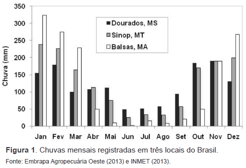 O consórcio cultivado na safra de verão (outubro a março) dispõe de maior volume de chuva e temperaturas mais elevadas durante a evolução do período, enquanto na safra de outono-inverno (safrinha), compreendida de abril a setembro, apresenta menor disponibilidade hídrica (Figura 1) e menores temperaturas. Por isso, nas condições de outono-inverno podem ocorrer maiores reduções na produtividade do milho safrinha do que no milho cultivado no verão (CECCON et al., 2009, 2012), o que requer maiores cuidados na implantação da braquiária. Dependendo do objetivo do consórcio, da modalidade de consorciação, do método de implantação e da população de plantas de braquiária a ser estabelecida, as perdas em milho podem ser minimizadas. Nessas condições, o milho deve ser cultivado como se fosse para o cultivo solteiro, sem alterações na adubação e na escolha de híbridos ou populações de plantas, preconizando alta produtividade.