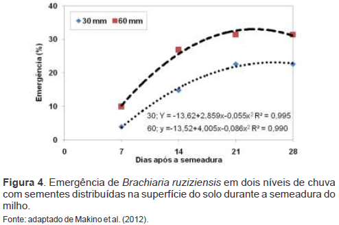 Assim como nas modalidades anteriores, a emergência defasada da braquiária em relação ao milho é uma oportunidade para estabelecer a braquiária em consórcio, com altas populações, sem causar redução na produtividade do milho, desde que a chuva ocorra até 7 a 14 dias após a semeadura do milho, considerando que a partir desse período a braquiária não tem seu perfeito estabelecimento (CECCON et al., 2009). No entanto, se houver chuva imediatamente após a semeadura, a braquiária terá emergência simultânea ou anterior ao milho, podendo causar reduções significativas na produtividade da cultura granífera. Nesse caso, assim como na modalidade em linha, pode-se lançar mão do uso de herbicidas para supressão do crescimento da forrageira (CECCON et al., 2010).