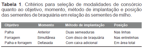 A escolha e seleção das modalidades de consórcio podem ser variadas, dependendo do ponto de partida para sua identificação, bem como seu objetivo, momento e método de implantação, e posição das sementes de braquiária em relação às linhas do milho (Tabela 1).