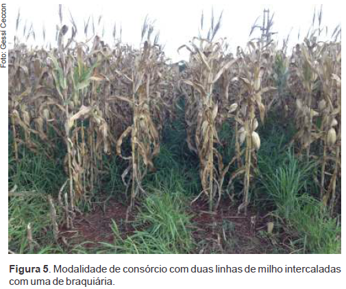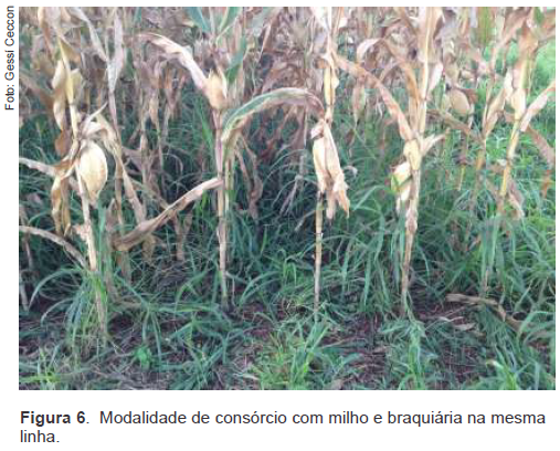 Pelo fato de o milho apresentar crescimento mais rápido que o da braquiária (SEREIA et al., 2012), a forrageira tem menor desenvolvimento em condições de sombreamento (SOUTO; ARONOVICH, 1992); com isso, esta modalidade pode ser utilizada para produção de palha ou formação pastagem, desde que a população de plantas seja ajustada para cada objetivo. No caso da competição entre a cultura granífera e a braquiária, há necessidade de utilização de herbicida para supressão do crescimento da forrageira (CECCON et al., 2010).