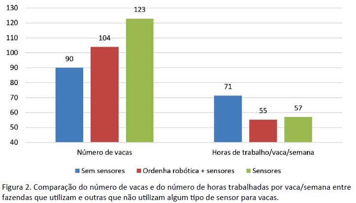 Em pesquisa realizada na Holanda, fazendas que adotaram algum tipo de tecnologia de precisão obtiveram uma redução de até 23% das horas trabalhadas por vaca/semana (Fig. 2) em comparação com aquelas que não faziam uso de sistemas de monitoramento por sensores (Steeneveld e Hogeveen, 2015).