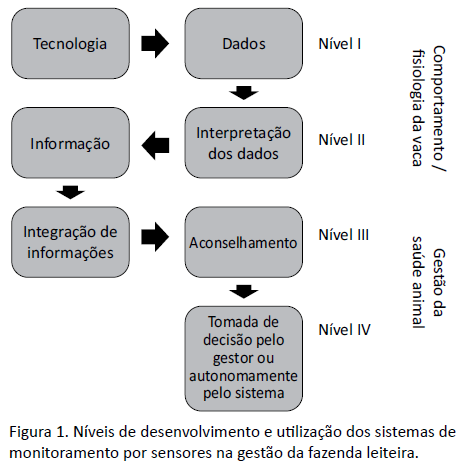 Tecnologias de precisão têm sido desenvolvidas com o objetivo de melhorar o gerenciamento dos rebanhos leiteiros e mensurar os indicadores produtivos, comportamentais e fisiológicos em benefício da saúde, produtividade e bem-estar animal (Steeneveld et al., 2015). As tecnologias de precisão utilizam sistemas de monitoramento por sensores. Esses sistemas podem ser descritos a partir de quatro níveis de desenvolvimento e utilização (Fig. 1): (I) tecnologia (sensor), que mensura algum parâmetro individual da vaca (ex.: consumo de alimento), gerando um conjunto de dados; (II) interpretação, que resume as alterações observadas no conjunto de dados gerados pelo sensor (ex.: diminuição do consumo) para produção de uma informação sobre o status da vaca (ex.: vaca com torção de abomaso); (III) integração dessa informação gerada pelo sensor, acrescida a outra informação (ex.: informação de cunho econômico), para proposição de um aconselhamento (ex.: operar ou não a vaca doente); (IV) tomada de decisão pelo gestor da fazenda ou autonomamente pelo sistema (ex.: o veterinário é acionado).