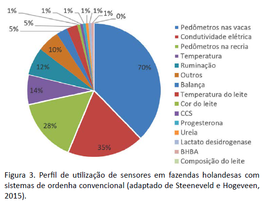 Quanto ao perfil dos produtores que utilizam tecnologias de precisão, existem os que usam determinados sistemas de monitoramento por sensores porque estão embarcados em algum equipamento adquirido, como, por exemplo, em sistemas de ordenha robotizados. Outros já o fazem de forma deliberada, investindo em sensores para melhorar a eficiência da gestão sobre a saúde do rebanho (Fig. 3) (Steeneveld e Hogeveen, 2015).