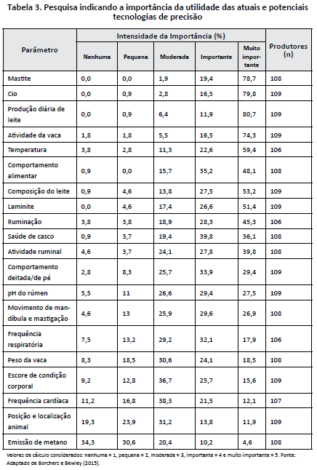 De forma geral, os sistemas de precisão disponíveis para a pecuária leiteira são compostos por equipamentos capazes de mensurar individualmente parâmetros fisiológicos ou comportamentais e detectar alterações relativas às condições de saúde da vaca, requerendo uma intervenção por parte do ges tor da fazenda (Steeneveld et al., 2015). Entre os sensores considerados de maior utilidade por produtores americanos, estão os de detecção de mastite, de cio e produção de leite (Borchers e Bewley, 2015) (Tab. 3).