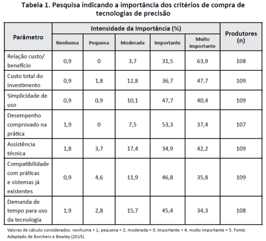 Além das questões relacionadas à mão de obra e facilidade de manejo, fatores (Tab. 1) como relação custo benefício, custo do investimento total e simplicidade de uso estão entre os principais critérios analisados no momento da adoção de tecnologias de precisão por produtores americanos (Borchers e Bewley, 2015).