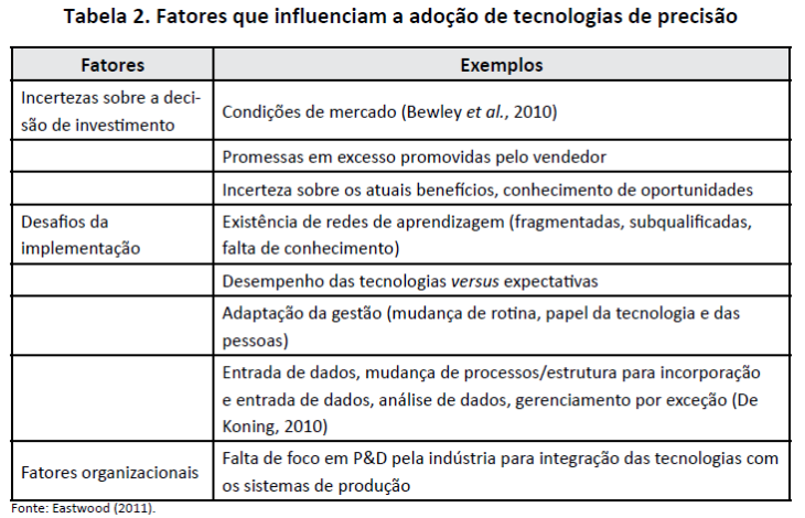 Bewley e Russell (2010) pesquisaram 229 produtores de leite americanos e identificaram que as razões mais comuns para a não adoção de tecnologias de precisão eram: (I) não estarem familiarizados com as tecnologias disponíveis (55%); (II) baixa relação custo/benefício (42%); (III) não saberem o que fazer com tantas informações fornecidas pelos sistemas (36%); (IV) tempo insuficiente para usufruir da tecnologia (31%); (V) falta de percepção do valor econômico (30%); (VI) tecnologias muito difíceis ou complexas para se usar (29%). Ademais, incertezas sobre as condições de mercado, do desempenho e reais benefícios das novas tecnologias e, ainda, problemas relacionados à adaptação da gestão e fatores organizacionais têm sido apontados (Tab. 2) como decisivos para a não adoção das tecnologias de precisão por parte dos produtores de leite (Bewley et al., 2010).